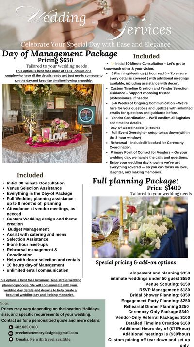 This is a great option for D.I.Y. Couples and couples that have most details already covered and need more help with tear down and set up as well as running the events of the day. So the Couple and their families can relax and a timeline can stay on point.
